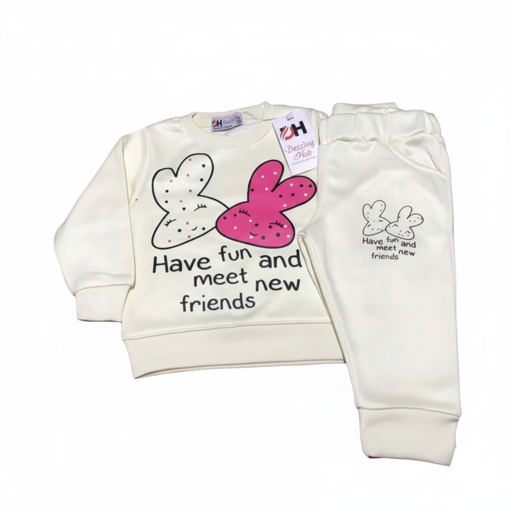 "This charming toddler loungewear set features cute bunny graphics and the motto 'Have fun and meet new friends,' perfect for playful days."